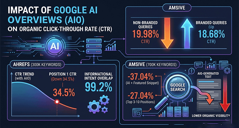 ·         Ahrefs: انخفاض معدل النقر للمركز الأول بنسبة 34.5% عند ظهور نظرات AI، استنادًا إلى 300,000 كلمة مفتاحية.
